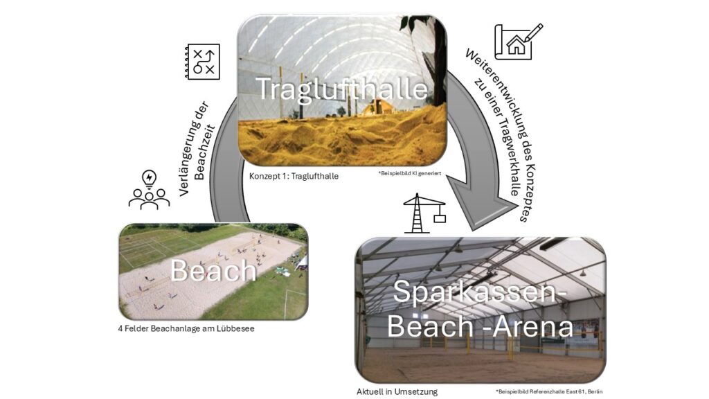 Bisher schlägt unser Herz vor allem unter freiem Himmel: Mit unseren vier Beachfeldern direkt am malerischen Lübbesee bieten wir die perfekte Kulisse für packende Ballwechsel im Sommer. Doch wir haben eine Vision, die über die warmen Monate hinausgeht.